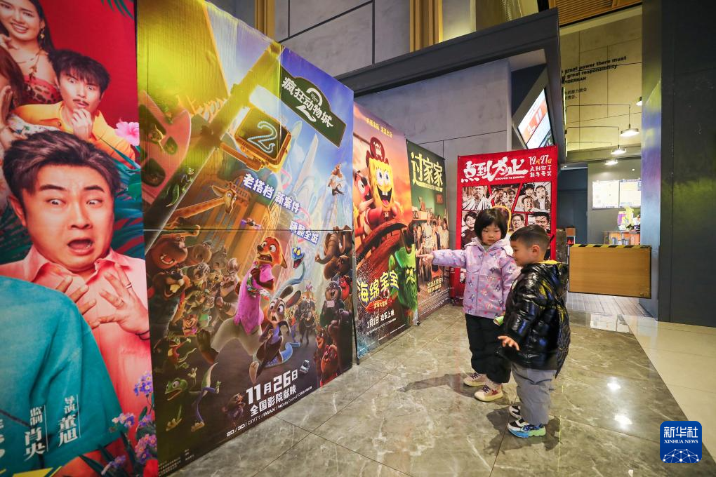 1月2日,江苏省海安市一家影城,两名小朋友在观看电影《疯狂动物城2》海报。新华社发(顾彬斌摄)