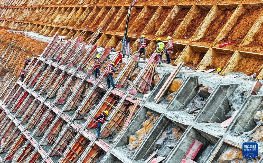 1月2日,在位于湖南省永州市新田县龙泉街道石甑源村的桂(东)新(田)高速建设工地,工人们进行防护坡施工作业(无人机照片)。新华社发(刘贵雄摄)