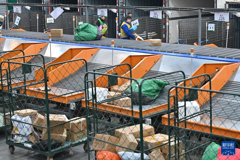 1月2日,工作人员在中国邮政集团有限公司商丘市分公司邮件处理中心搬运快递。新华社发(李恒摄)
