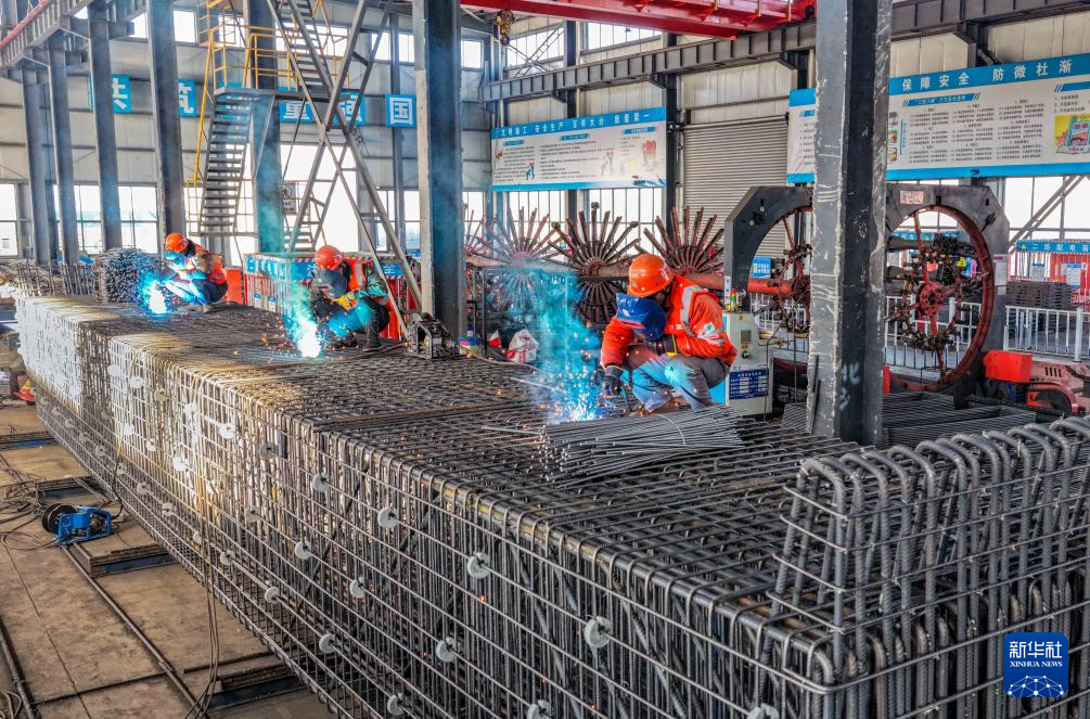 1月2日,工人在位于江苏省兴化经济开发区的中建七局宁盐高速泰州1标段钢筋加工场进行焊接作业(无人机照片)。新华社发(周社根摄)