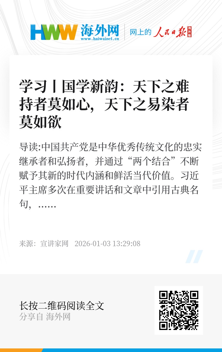 中国共产党是中华优秀传统文化的忠实继承者和弘扬者,并通过“两个结合”不断赋予其新的时代内涵和鲜活当代价值。习近平主席多次在重要讲话和文章中引用古典名句,寓意深邃,生动传神,闪耀着中华优秀传统文化博大精深的智慧光芒,极具启迪意义。本期节目,中共中央党校(国家行政学院)哲学教研部博士聂菲璘从习近平主席引用的“天下之难持者莫如心,天下之易染者莫如欲”切入,为我们讲解这一诗句的创作背景、核心内涵与当代启示,并进一步揭示了党员干部为什么要修身立德的核心命题。欢迎观看。