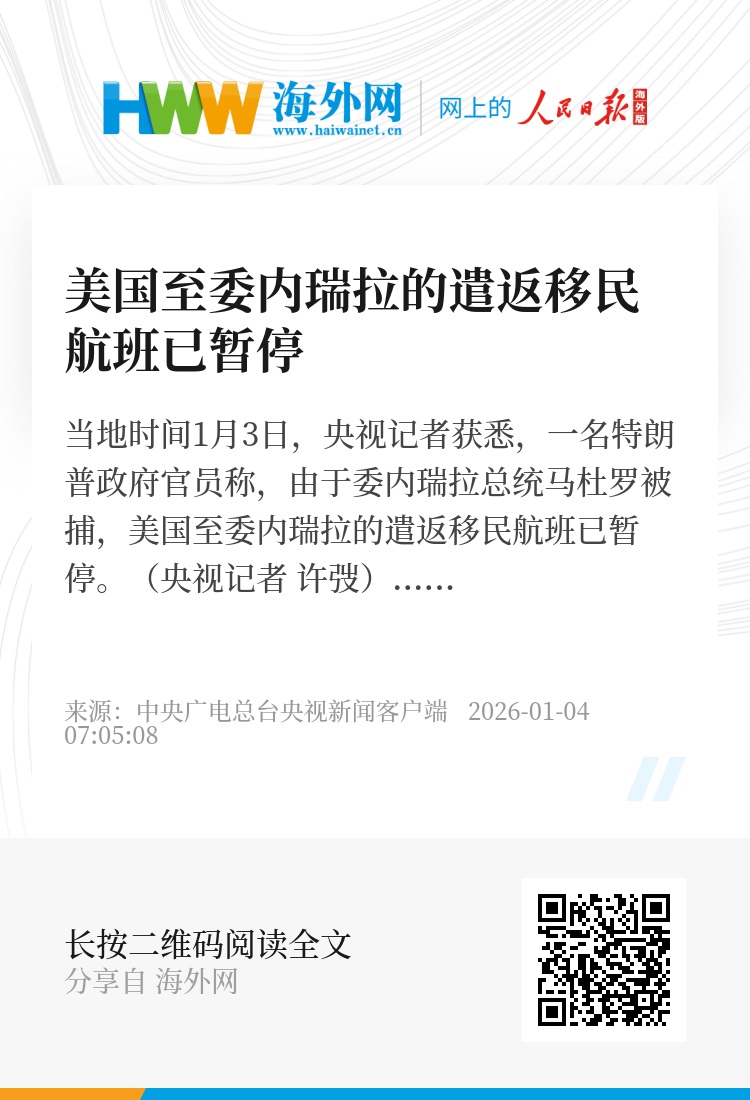 当地时间1月3日,央视记者获悉,一名特朗普政府官员称,由于委内瑞拉总统马杜罗被捕,美国至委内瑞拉的遣返移民航班已暂停。(央视记者 许弢)