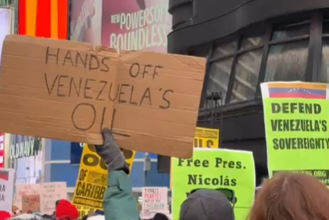 在纽约,人们聚集在时代广场的美国陆军征兵办公室外,手持反对对委内瑞拉开战的标语。