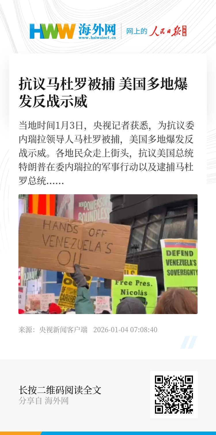 当地时间1月3日,央视记者获悉,为抗议委内瑞拉领导人马杜罗被捕,美国多地爆发反战示威。各地民众走上街头,抗议美国总统特朗普在委内瑞拉的军事行动以及逮捕马杜罗总统及其夫人。