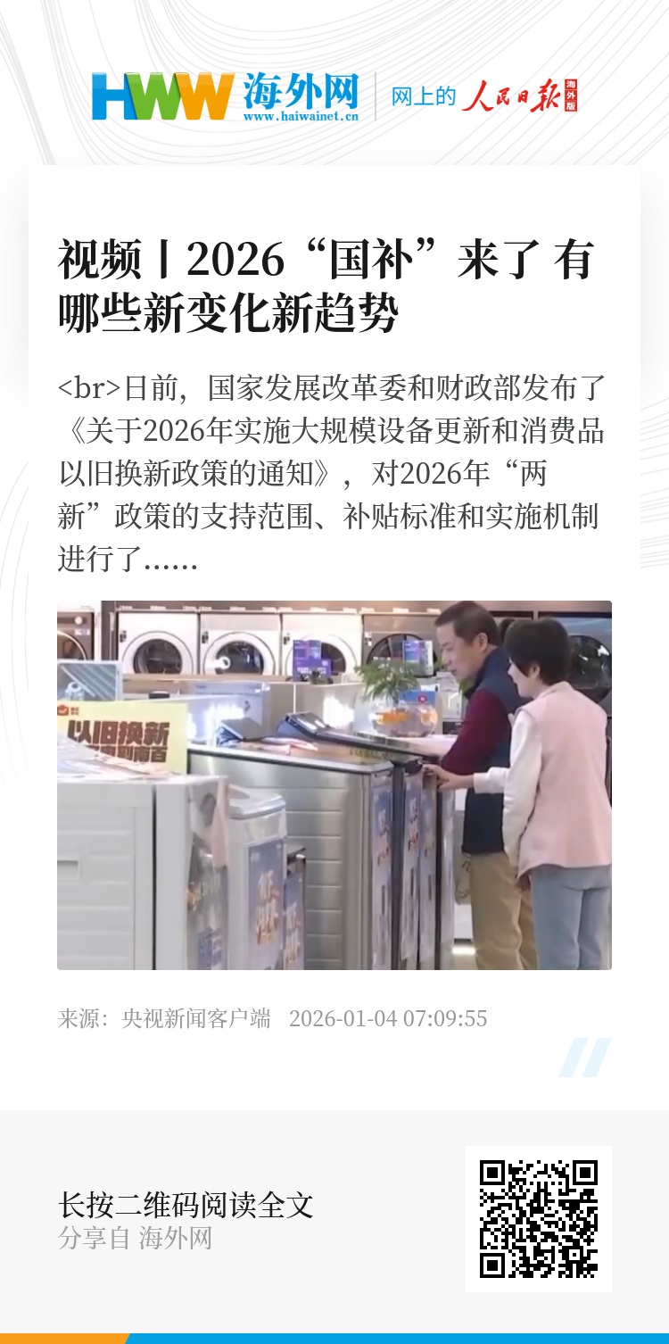 日前,国家发展改革委和财政部发布了《关于2026年实施大规模设备更新和消费品以旧换新政策的通知》,对2026年“两新”政策的支持范围、补贴标准和实施机制进行了明确和优化。国家发展改革委会同财政部已向地方提前下达2026年第一批625亿元超长期特别国债,支持消费品以旧换新资金计划。