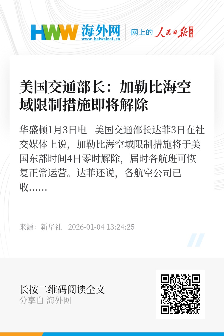 新华社华盛顿1月3日电 美国交通部长达菲3日在社交媒体上说,加勒比海空域限制措施将于美国东部时间4日零时解除,届时各航班可恢复正常运营。