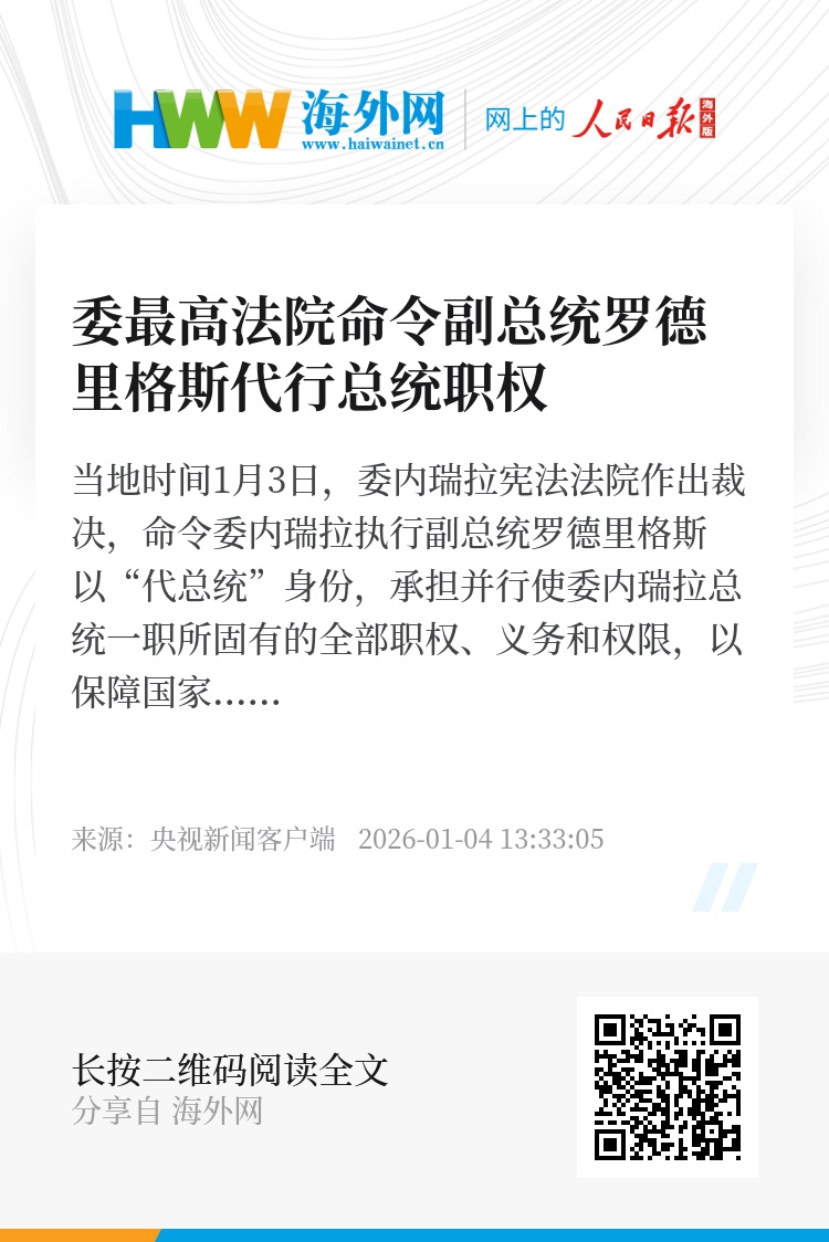 当地时间1月3日,委内瑞拉宪法法院作出裁决,命令委内瑞拉执行副总统罗德里格斯以“代总统”身份,承担并行使委内瑞拉总统一职所固有的全部职权、义务和权限,以保障国家行政连续性和国家的全面防御。(总台记者 马天静)