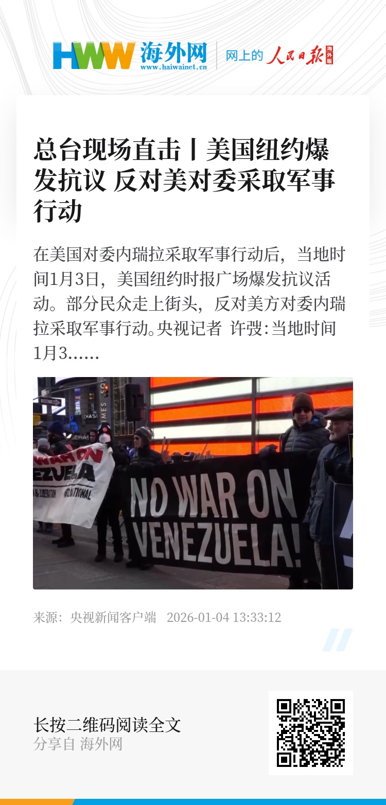 央视记者 许弢:当地时间1月3日,在美国对委内瑞拉采取军事行动后,全美多地都爆发了抗议活动。在纽约时报广场,数百人聚集在这里,反对美国对委内瑞拉采取军事干预。