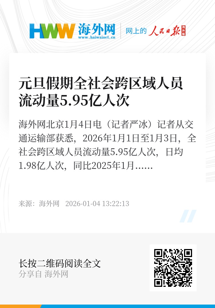 海外网北京1月4日电(记者严冰)记者从交通运输部获悉,2026年1月1日至1月3日,全社会跨区域人员流动量5.95亿人次,日均1.98亿人次,同比2025年1月1日至3日日均(下同)增长19.62%,同比2024年元旦假期日均(2023年12月30日至2024年1月1日)增长5.74%。其中: