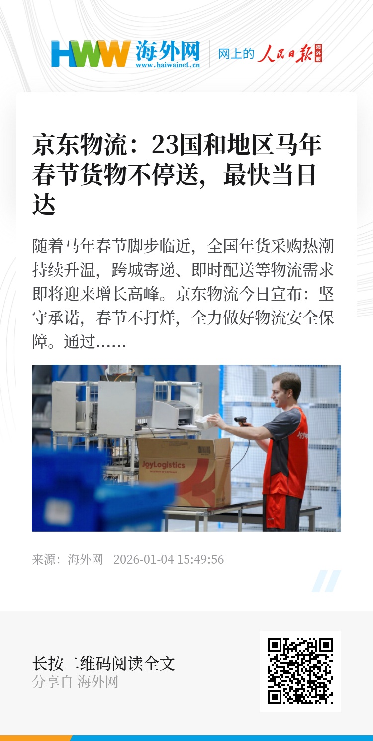 值得关注的是,春季临近之际,马年元素饰品、春联、彩灯装饰等具有中国特色的商品正通过京东物流跨境网络运送至全球多个国家。数据显示:进入12月以来相关商品量已持续增加,相较年中,京东物流中美线路跨境小包货量已经增长超100%,创下历史新高。目前,京东物流已经构建起了覆盖全球多数国家和地区的跨境物流网络,最快4天即可到达。