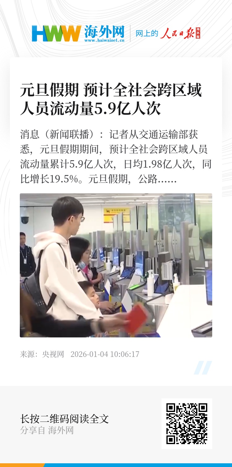 央视网消息(新闻联播):记者从交通运输部获悉,元旦假期期间,预计全社会跨区域人员流动量累计5.9亿人次,日均1.98亿人次,同比增长19.5%。