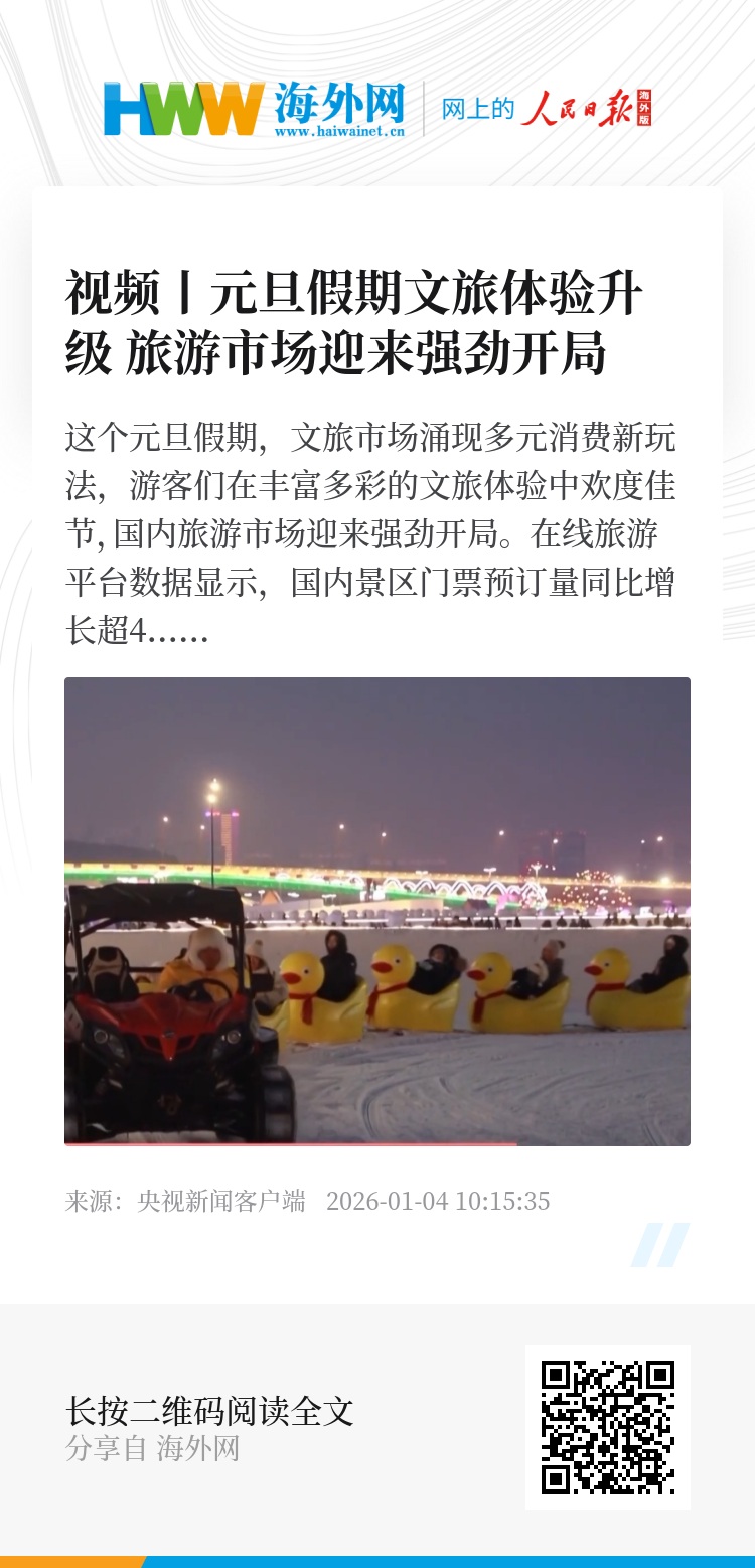 这个元旦假期,文旅市场涌现多元消费新玩法,游客们在丰富多彩的文旅体验中欢度佳节,国内旅游市场迎来强劲开局。