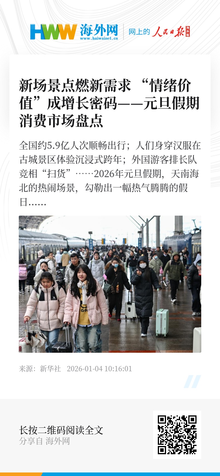 全国约5.9亿人次顺畅出行;人们身穿汉服在古城景区体验沉浸式跨年;外国游客排长队竞相“扫货”……2026年元旦假期,天南海北的热闹场景,勾勒出一幅热气腾腾的假日消费画卷,折射中国经济的活力与热度。