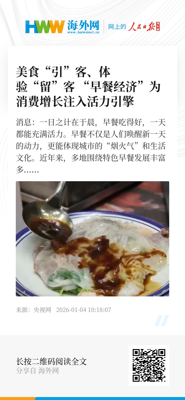 央视网消息:一日之计在于晨,早餐吃得好,一天都能充满活力。早餐不仅是人们唤醒新一天的动力,更能体现城市的“烟火气”和生活文化。近年来,多地围绕特色早餐发展丰富多样的新业态、新消费场景。汕头是一座以“美食”为文化名片的城市,无论是搭配“灵魂”沙茶酱的牛肉火锅,还是鲜甜的各式海鲜,讲究食材本味是汕头美食的最大特色。