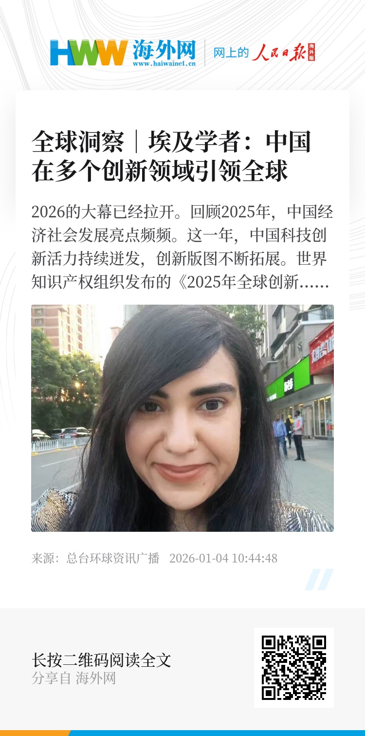 新年伊始,埃及本尼苏伊夫大学副教授纳迪亚•赫尔米(Nadia Helmy)在接受总台环球资讯《全球洞察》记者专访时表示,中国在多个创新领域引领全球。埃及是首个在共建“一带一路”框架下与中国开展卫星合作的国家,纳迪亚•赫尔米在专访中特别提到了埃中之间的卫星合作。