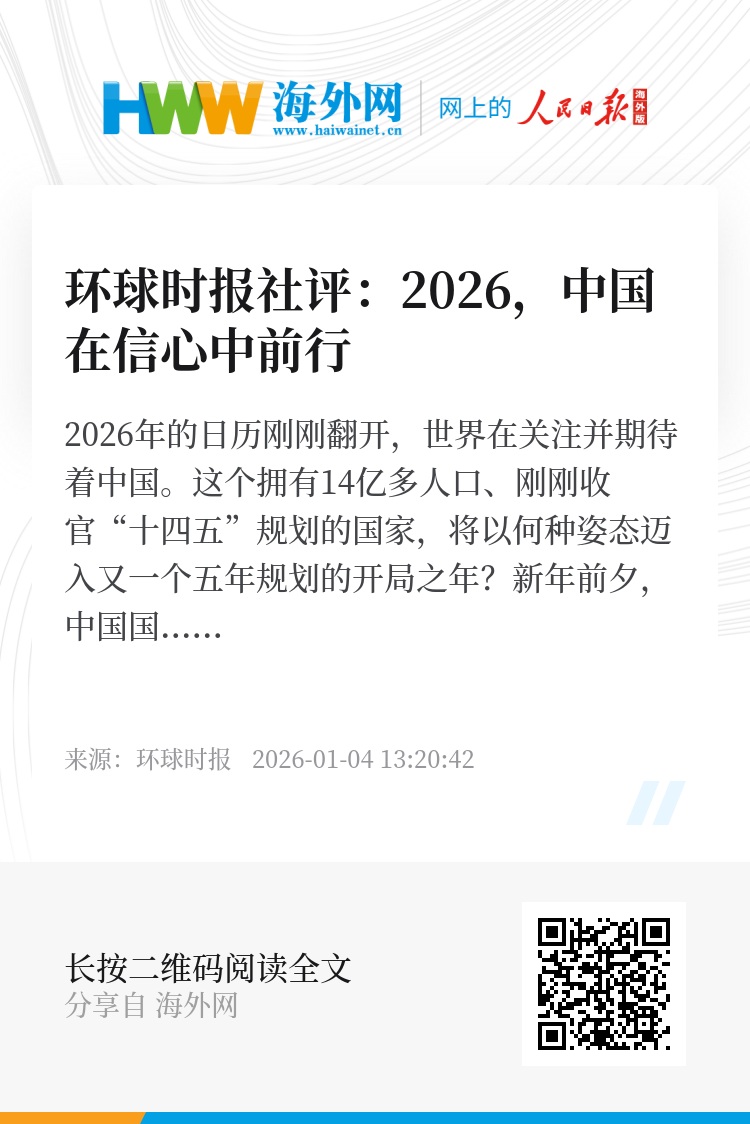 展望2026,一个更加注重发展质量、更加主动拥抱世界、更加关注人民生活的中国,正展现在世界面前。“十五五”开局之年的中国展现出的战略定力、改革决心、创新动能与开放姿态,构成了笃定前行的底气。当世界的目光注视东方,看到的是一个在复杂变局中稳舵奋楫、在接续奋斗中积累信心的中国。这份信心,属于中国人民,也属于所有期待和平、发展与合作的各方。心有所信,方能行远。中国将与世界一道,携手驶向新的未来。