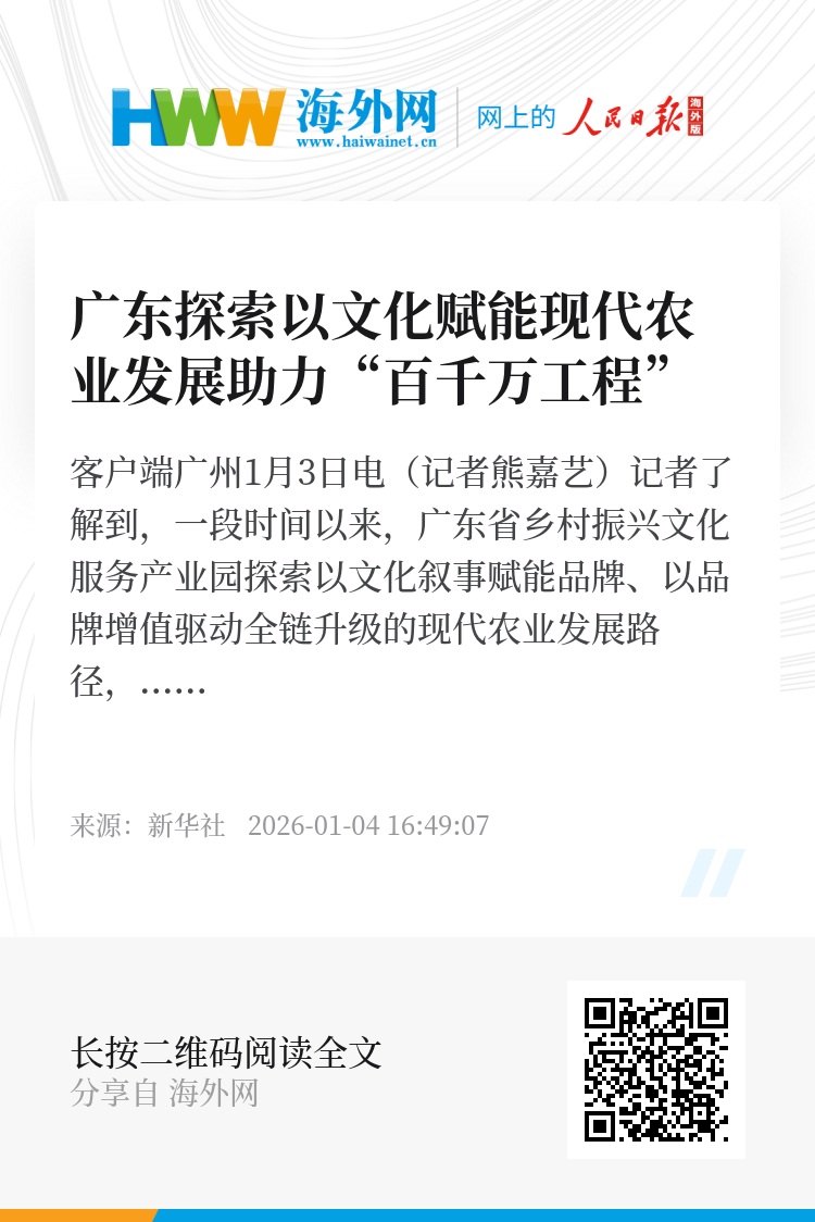 新华社客户端广州1月3日电(记者熊嘉艺)记者了解到,一段时间以来,广东省乡村振兴文化服务产业园探索以文化叙事赋能品牌、以品牌增值驱动全链升级的现代农业发展路径,为“百县千镇万村高质量发展工程”落地和农业高质量发展提供支撑。