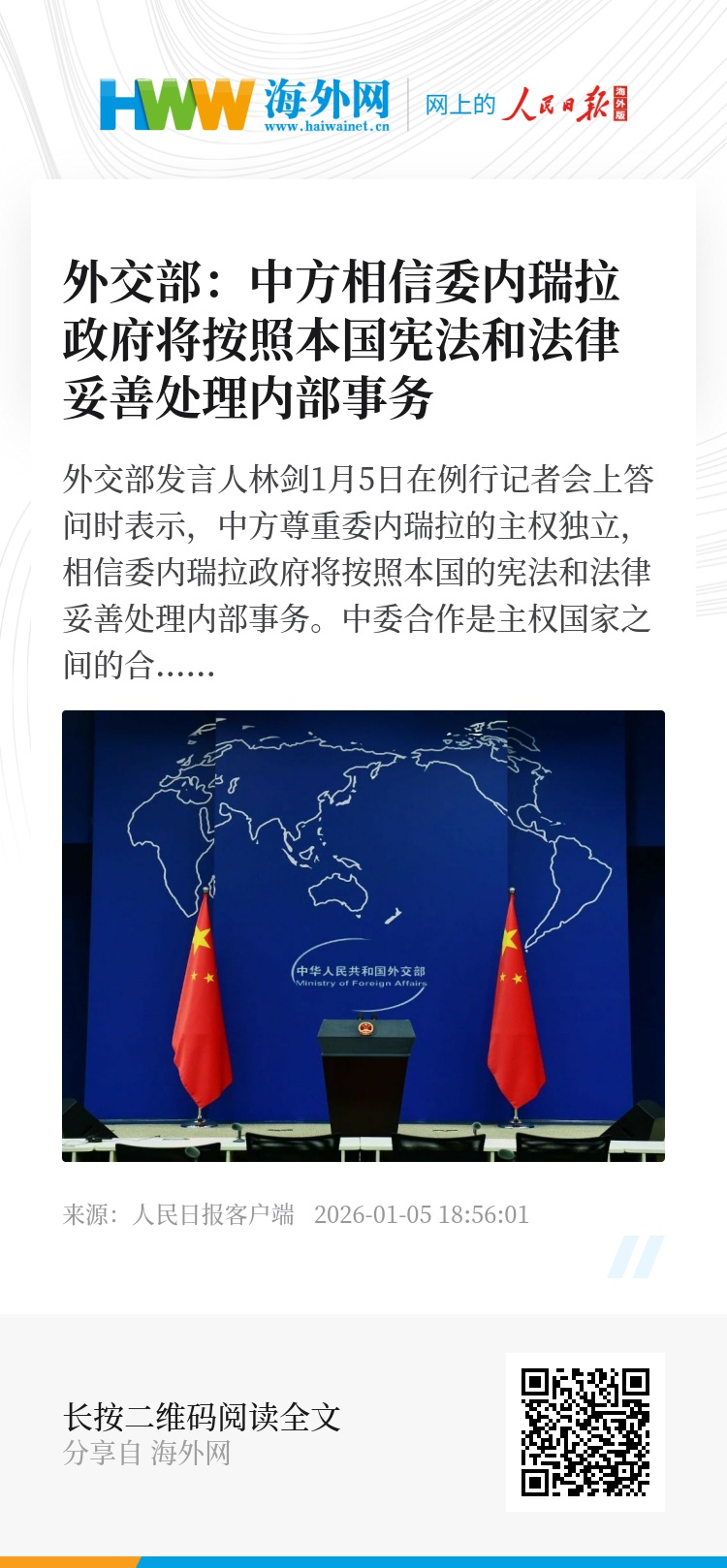 外交部发言人林剑1月5日在例行记者会上答问时表示,中方尊重委内瑞拉的主权独立,相信委内瑞拉政府将按照本国的宪法和法律妥善处理内部事务。中委合作是主权国家之间的合作,受到国际法和两国法律的保护。无论委内瑞拉政局如何变化,中方深化两国各领域务实合作的意愿不会改变,中方在委内瑞拉的合法利益也将依法受到保护。