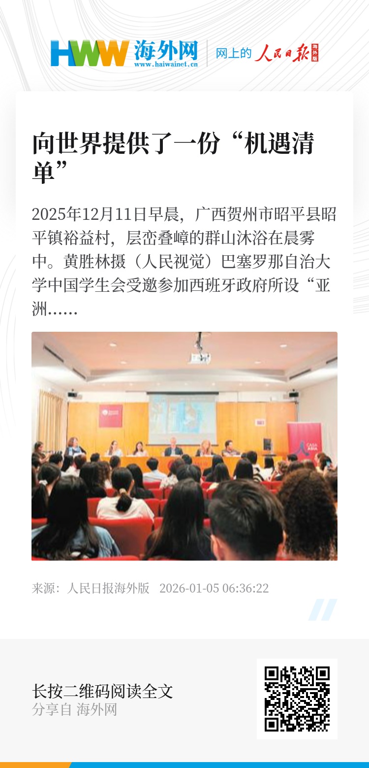 2026年是“十五五”开局之年。随着中共二十届四中全会审议通过“十五五”规划建议,一幅通往未来的壮阔画卷正徐徐铺展。这不仅为未来五年中国发展擘画蓝图,也向世界提供了一份饱含温度与希望的“机遇清单”。