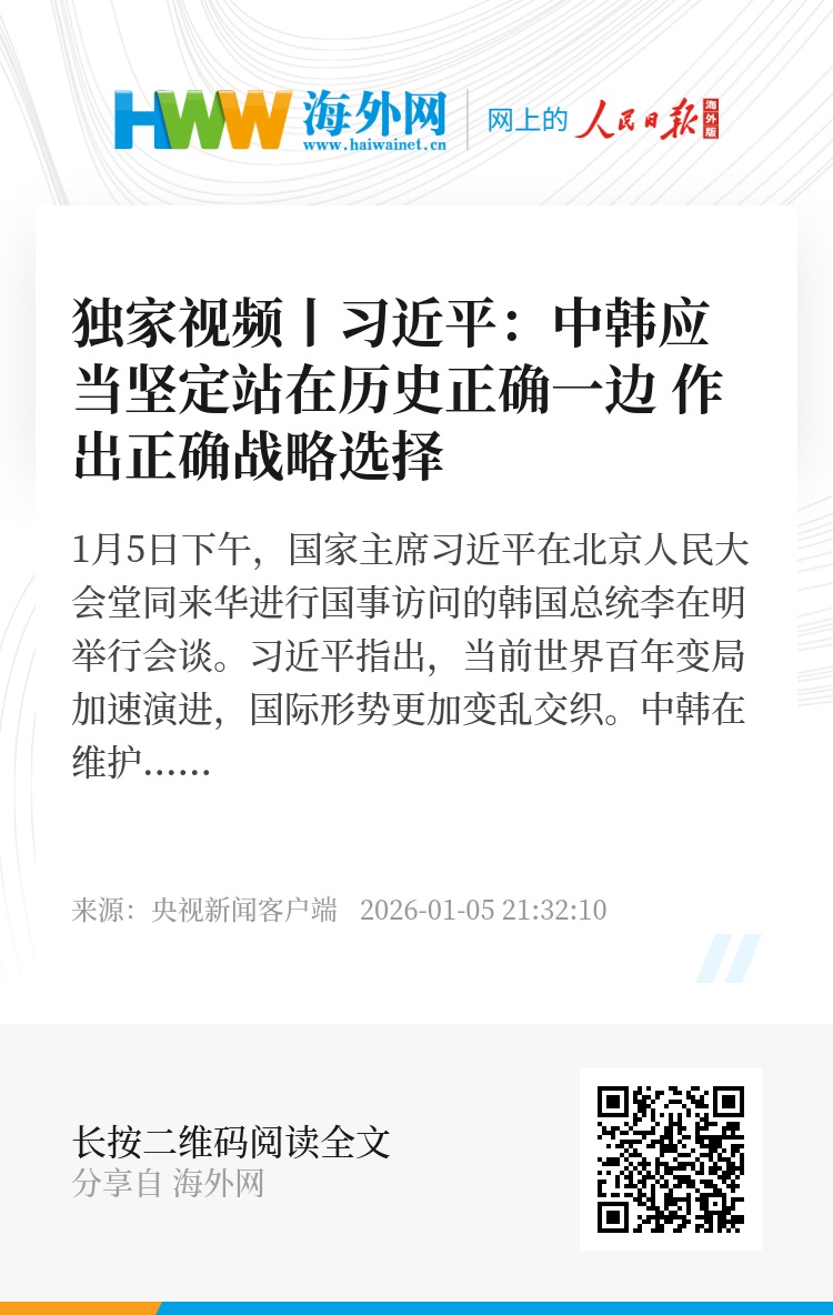 1月5日下午,国家主席习近平在北京人民大会堂同来华进行国事访问的韩国总统李在明举行会谈。