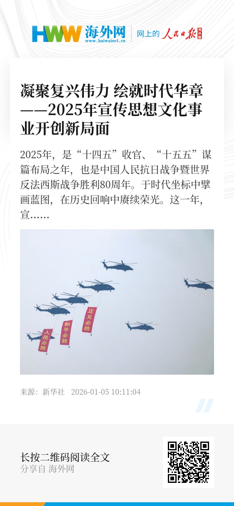 一年来,宣传思想文化战线紧紧围绕抗战胜利80周年主题主线,大力弘扬伟大抗战精神,引导中华儿女厚植爱国之情、砥砺报国之志。