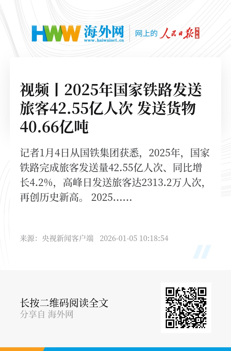 记者1月4日从国铁集团获悉,2025年,国家铁路完成旅客发送量42.55亿人次、同比增长4.2%,高峰日发送旅客达2313.2万人次,再创历史新高。