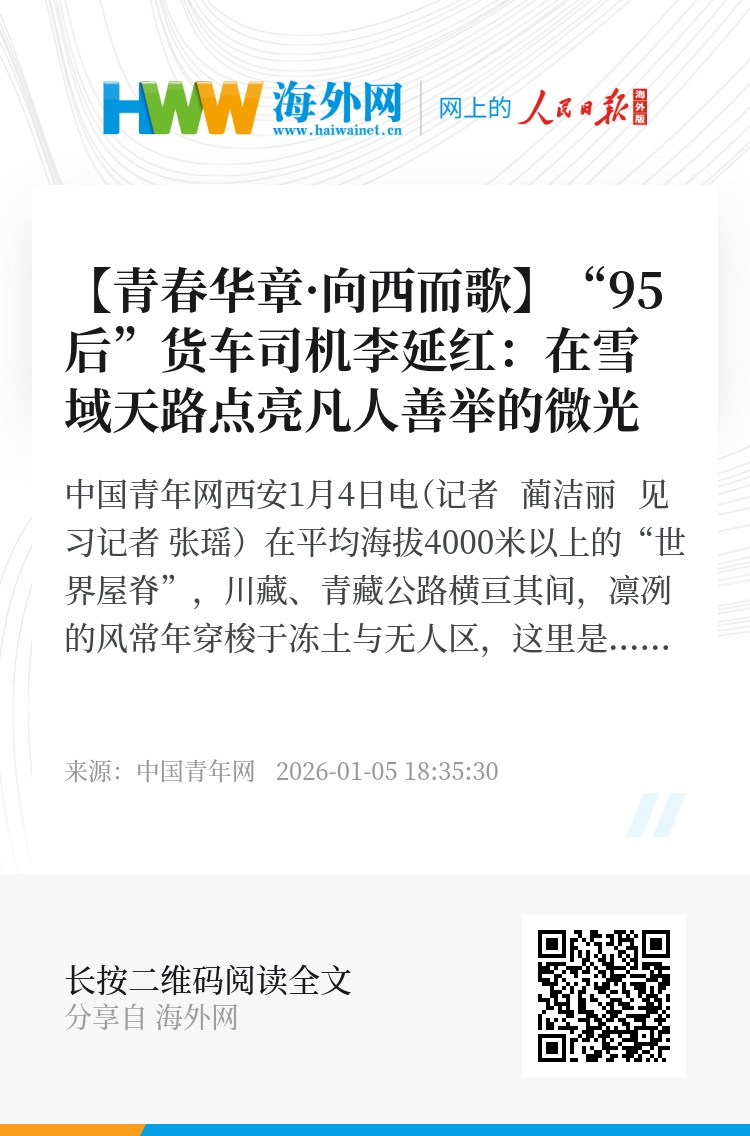中国青年网西安1月4日电(记者 蔺洁丽 见习记者 张瑶)在平均海拔4000米以上的“世界屋脊”,川藏、青藏公路横亘其间,凛冽的风常年穿梭于冻土与无人区,这里是货运司机眼中极具挑战的“天路”。自1954年通车以来,“两路”承担着进出藏物资运输的主要任务,是西藏名副其实的经济命脉。来自青海大通的“95后”货车司机李延红,已在这条路上奔波了四年。