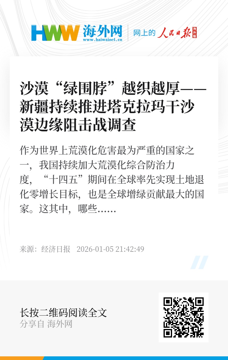 作为世界上荒漠化危害最为严重的国家之一,我国持续加大荒漠化综合防治力度,“十四五”期间在全球率先实现土地退化零增长目标,也是全球增绿贡献最大的国家。这其中,哪些荒漠化防治成果令人叹为观止?治沙增绿成果是否得到有效巩固?2025年末,经济日报记者走进沙漠探寻答案。