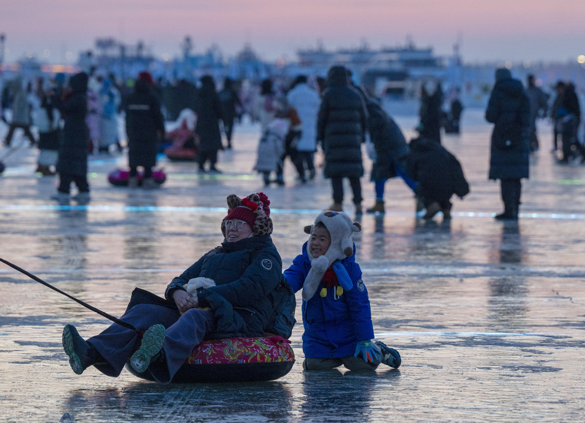 1月2日,人们在第八届哈尔滨松花江冰雪嘉年华园区内体验冰上娱乐项目。(图片来源:新华社)