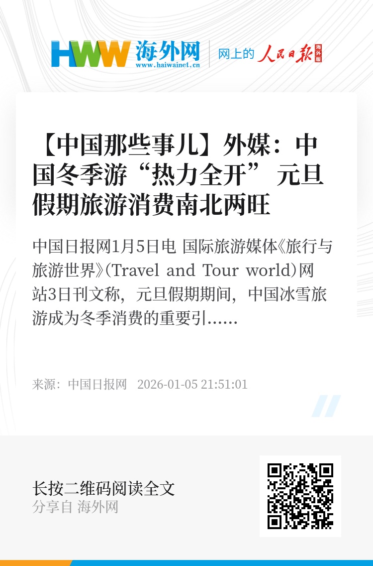 中国日报网1月5日电 国际旅游媒体《旅行与旅游世界》(Travel and Tour world)网站3日刊文称,元旦假期期间,中国冰雪旅游成为冬季消费的重要引擎,国内外游客纷纷涌向雪乡、滑雪场及温泉度假区。多地游客数量创下新高,预订量显著攀升。旅游需求的集中释放,凸显出人们对冬季运动与季节性出游的热情持续高涨。