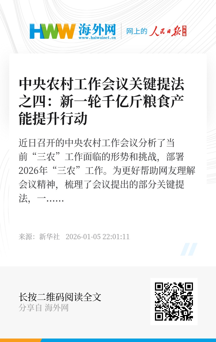近日召开的中央农村工作会议分析了当前“三农”工作面临的形势和挑战,部署2026年“三农”工作。为更好帮助网友理解会议精神,新华网梳理了会议提出的部分关键提法,一起来学习。