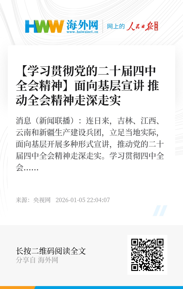 央视网消息(新闻联播):连日来,吉林、江西、云南和新疆生产建设兵团,立足当地实际,面向基层开展多种形式宣讲,推动党的二十届四中全会精神走深走实。