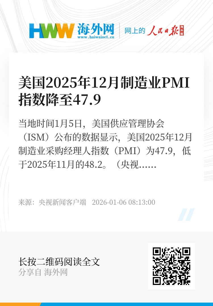 当地时间1月5日,美国供应管理协会(ISM)公布的数据显示,美国2025年12月制造业采购经理人指数(PMI)为47.9,低于2025年11月的48.2。(央视记者 吴汉婴)