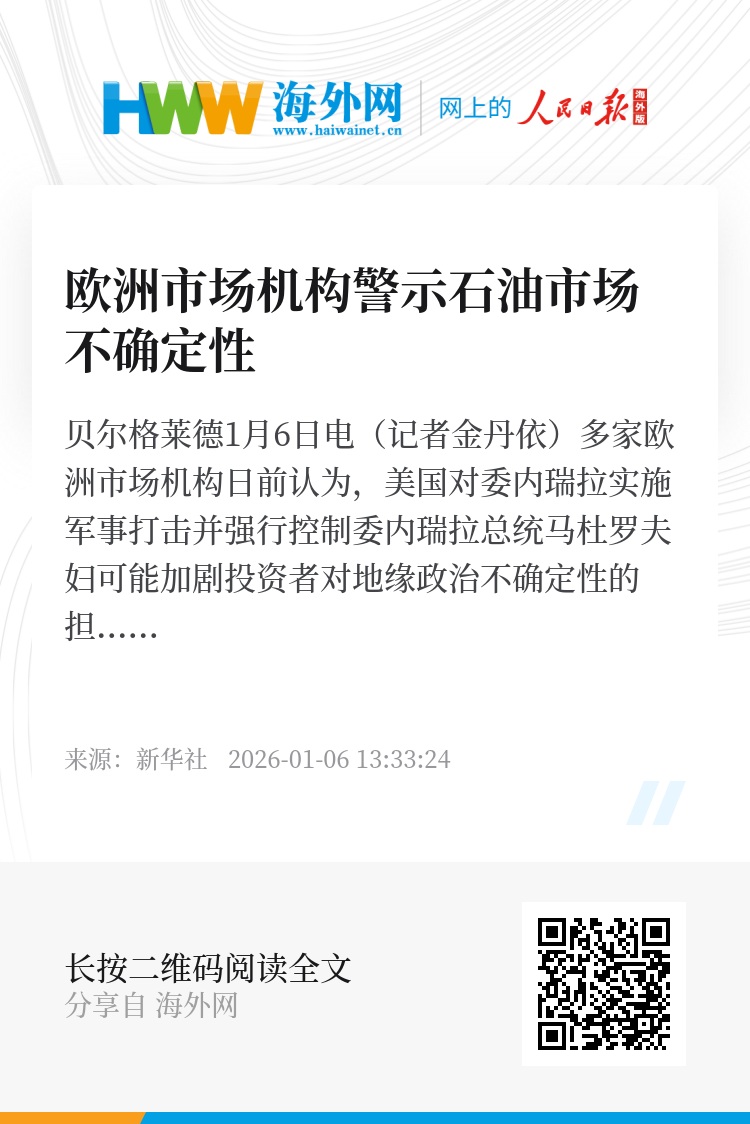 新华社贝尔格莱德1月6日电(记者金丹依)多家欧洲市场机构日前认为,美国对委内瑞拉实施军事打击并强行控制委内瑞拉总统马杜罗夫妇可能加剧投资者对地缘政治不确定性的担忧,对石油市场供应和风险预期造成影响。