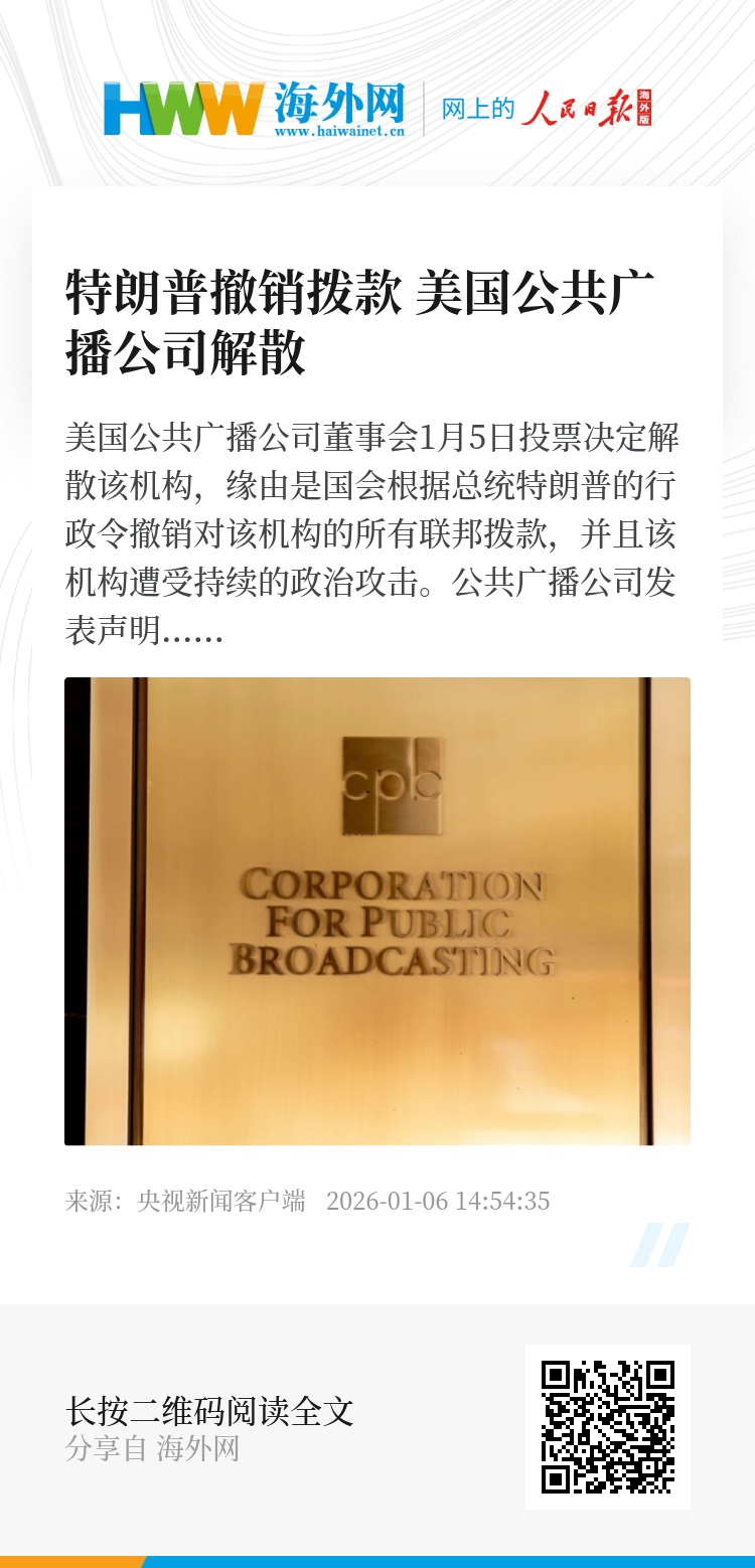 特朗普去年5月签署行政令,终止对美国公共广播公司、美国全国公共广播电台等公共媒体的联邦资助,称这些媒体的报道“不公平、不准确、带有偏见”。公共广播公司随后起诉特朗普政府,并逐步缩减规模。
