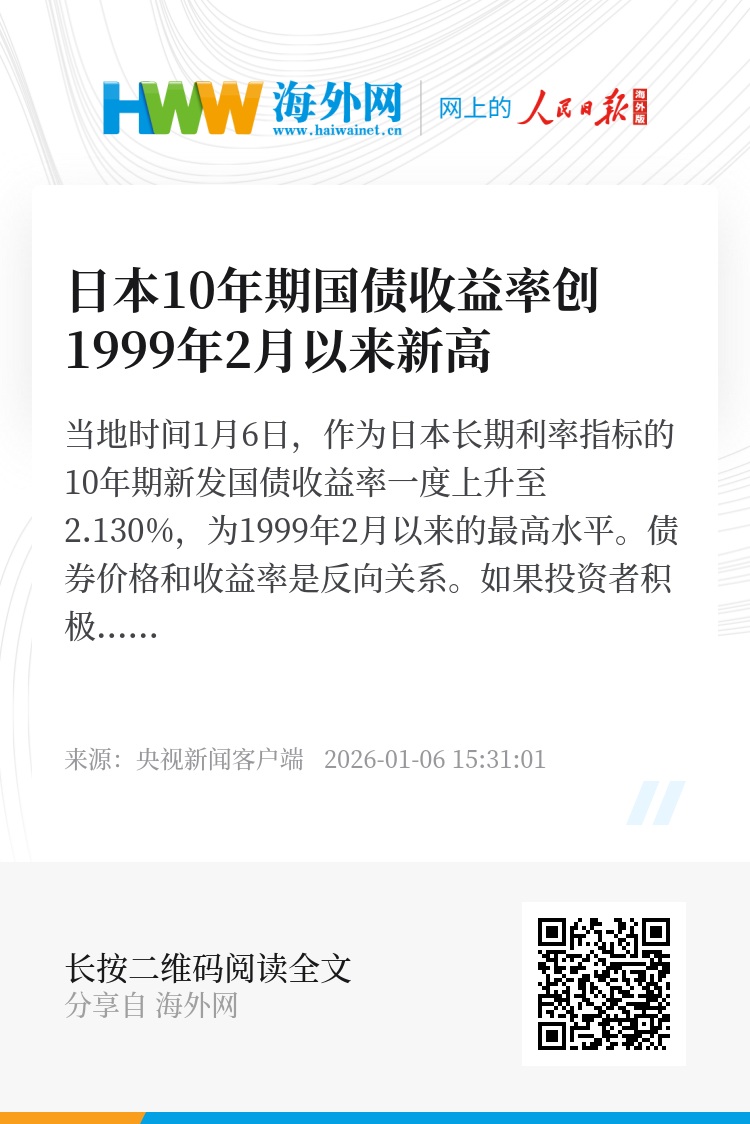 当地时间1月6日,作为日本长期利率指标的10年期新发国债收益率一度上升至2.130%,为1999年2月以来的最高水平。