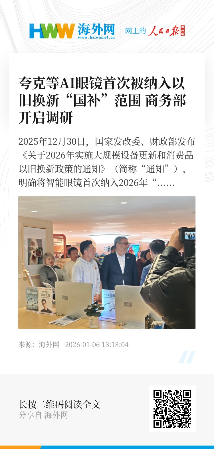 针对消费品以旧换新政策,商务部部长王文涛元旦期间在上海第一百货商业中心开启调研,并深度体验夸克AI眼镜等被纳入新一轮以旧换新补贴的科技新品。第一百货商业中心所属的百联集团官方微信公众号称,吴良材正携手夸克AI眼镜打造集“上海首发+首展+首戴”为一体的智能穿戴体验,王文涛一行深度体验了这些高科技产品。