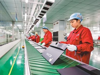 1月5日,江西省瑞昌经开区智造小镇一科技公司车间内,工人正在生产线上组装智能终端产品。魏东升摄(人民视觉)