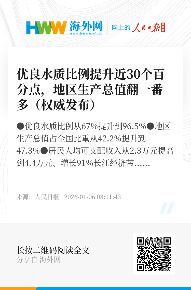 长江经济带发展是我国区域重大战略。10年来,长江经济带优良水质比例从67%提升到96.5%,地区生产总值翻了一番多、占全国比重从42.2%提升到47.3%。1月5日,国务院新闻办举行新闻发布会,介绍长江经济带发展10年来的工作进展和成效。