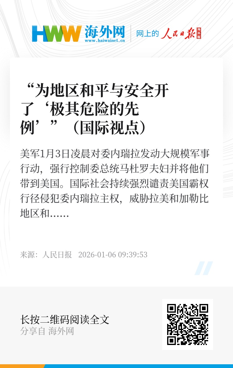 美军1月3日凌晨对委内瑞拉发动大规模军事行动,强行控制委总统马杜罗夫妇并将他们带到美国。国际社会持续强烈谴责美国霸权行径侵犯委内瑞拉主权,威胁拉美和加勒比地区和平与安全,敦促其遵守国际法及《联合国宪章》宗旨和原则,停止侵犯别国的主权安全。