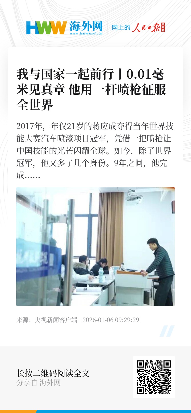 2017年,年仅21岁的蒋应成夺得当年世界技能大赛汽车喷漆项目冠军,凭借一把喷枪让中国技能的光芒闪耀全球。如今,除了世界冠军,他又多了几个身份。9年之间,他完成了从赛场到讲台、从工匠到人大代表的华丽转身。他的成长之路,不仅仅是一个青年的奋斗光影,也是国家职业教育蓬勃发展、技能人才奔涌向前的时代脉动。