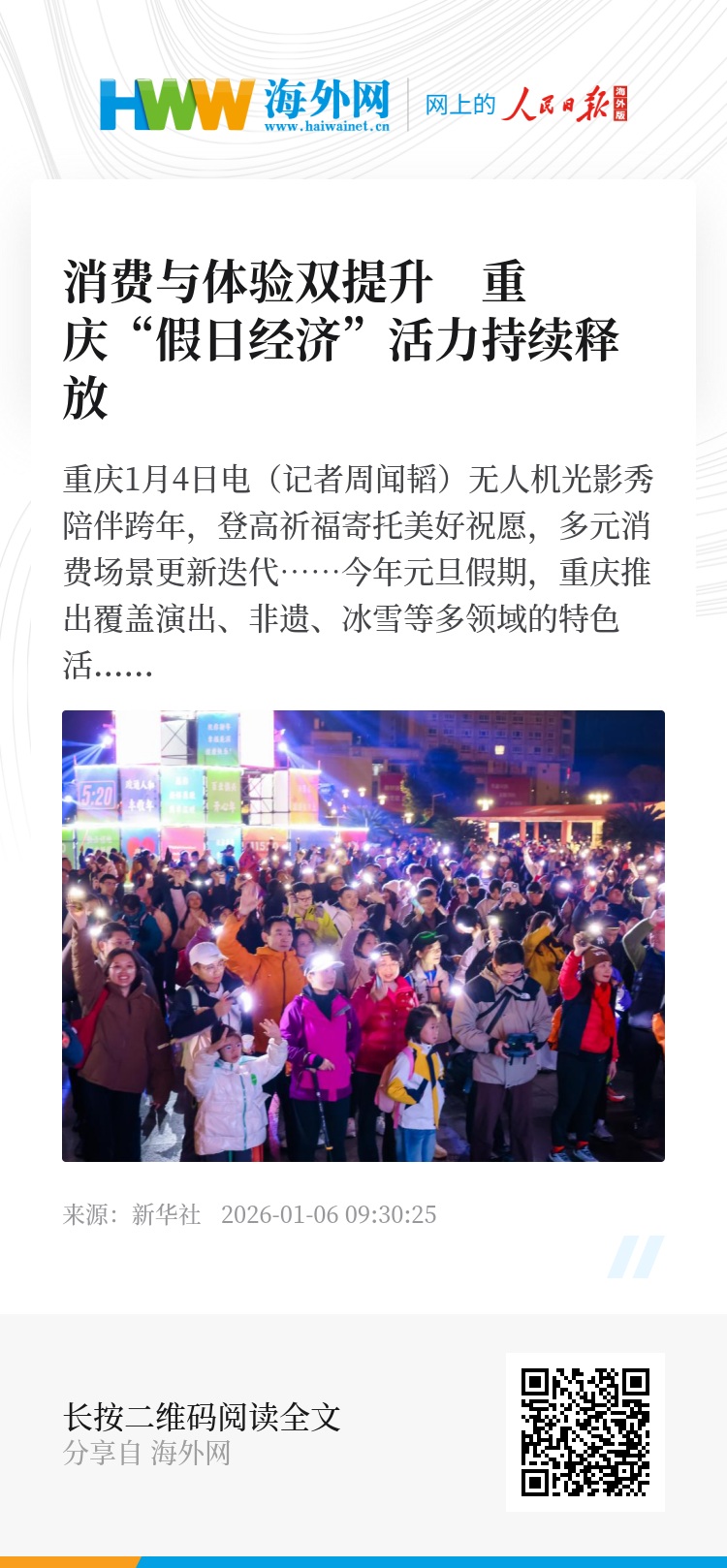 新华社重庆1月4日电(记者周闻韬)无人机光影秀陪伴跨年,登高祈福寄托美好祝愿,多元消费场景更新迭代……今年元旦假期,重庆推出覆盖演出、非遗、冰雪等多领域的特色活动,山城独特的自然与人文景观吸引力持续凸显,旅游消费市场“热气腾腾”。