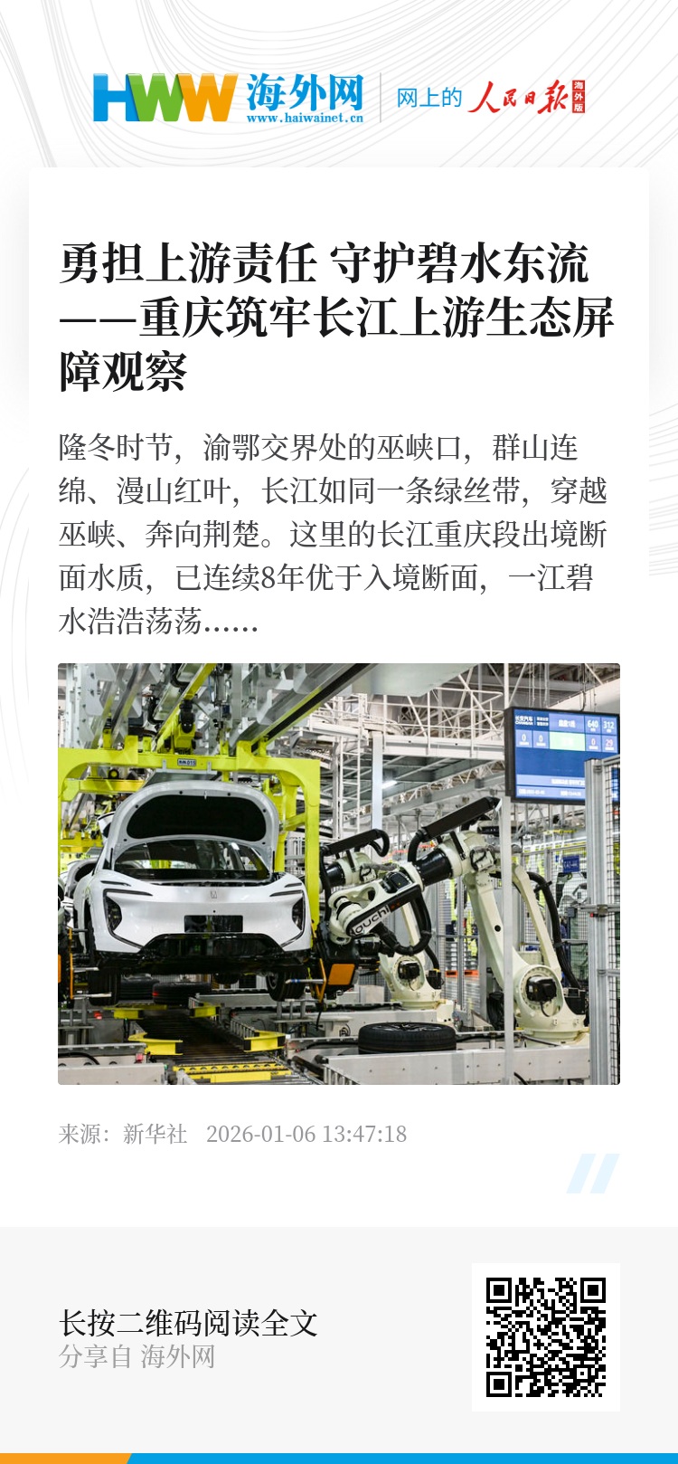强化“上游意识”、担起“上游责任”,守护一江清水向东流,重庆统筹推进高水平保护和高质量发展、高品质生活、高效能治理,奋力在长江经济带绿色发展中作出新贡献。