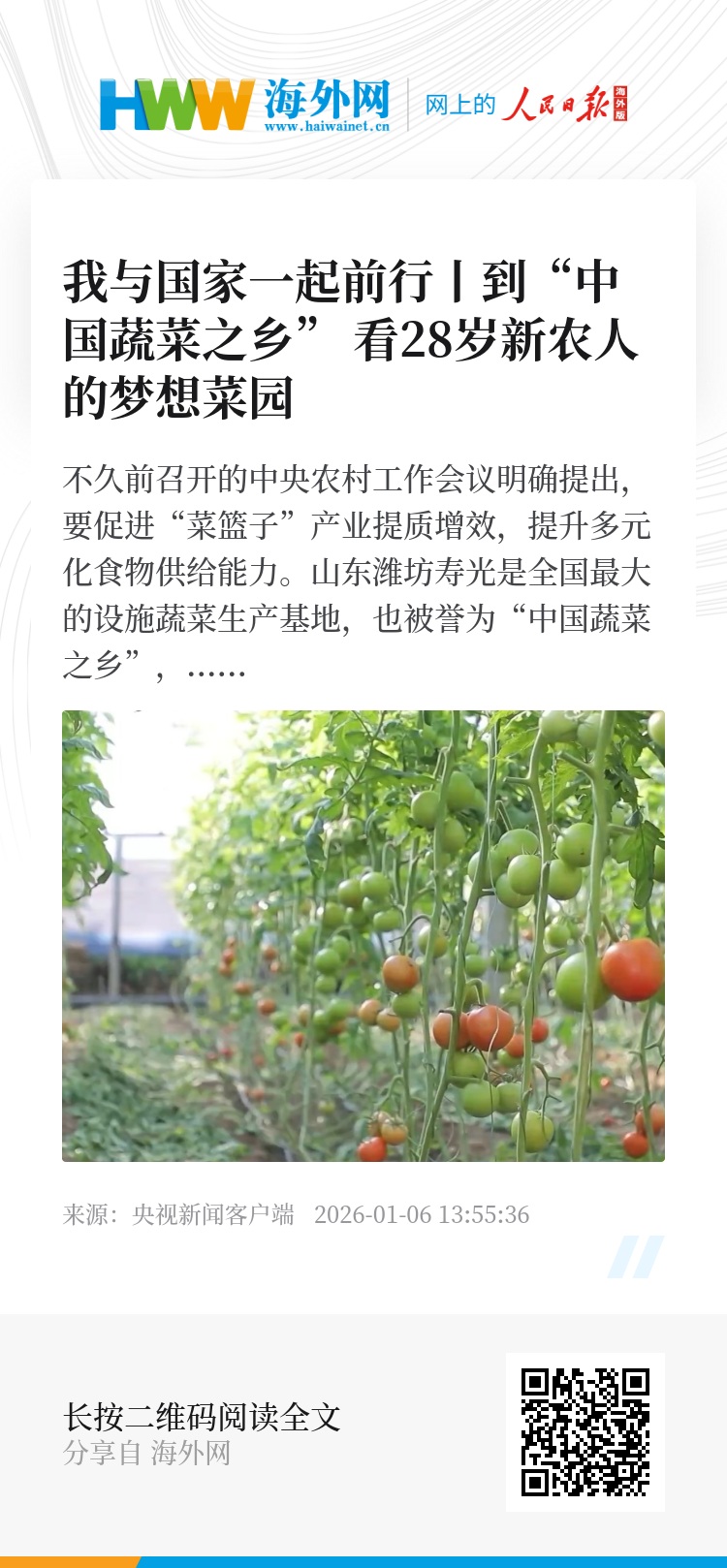 距离春节还有一个多月时间,现在又是蔬菜保供的关键时期,寿光的15.7万个大棚里生机盎然,每天有大约2万吨蔬菜从寿光装车,发往全国各地。从一粒种子到一盘蔬菜,寿光用科技为农业赋能,用创新为丰收护航,每一座智慧大棚里都孕育着希望,每一份新鲜蔬菜都承载着新农人的梦想。