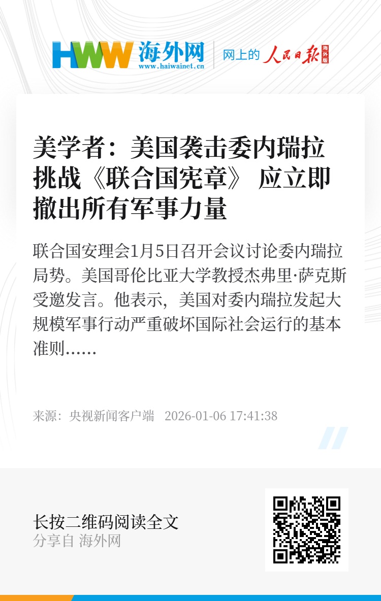 联合国安理会1月5日召开会议讨论委内瑞拉局势。美国哥伦比亚大学教授杰弗里·萨克斯受邀发言。他表示,美国对委内瑞拉发起大规模军事行动严重破坏国际社会运行的基本准则,各国需要捍卫《联合国宪章》,否则将面临严重后果。