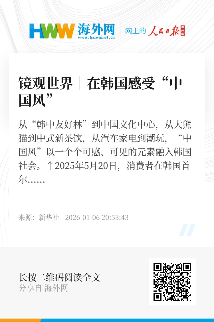 从“韩中友好林”到中国文化中心,从大熊猫到中式新茶饮,从汽车家电到潮玩,“中国风”以一个个可感、可见的元素融入韩国社会。