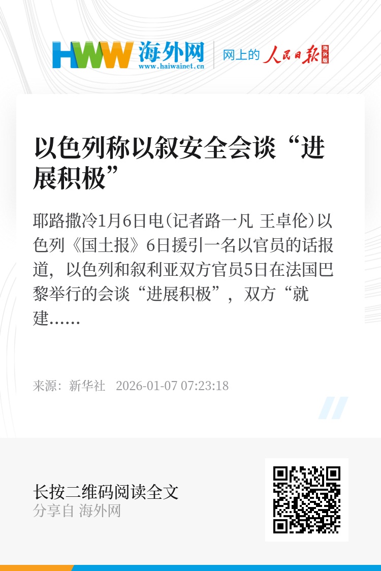 新华社耶路撒冷1月6日电(记者路一凡 王卓伦)以色列《国土报》6日援引一名以官员的话报道,以色列和叙利亚双方官员5日在法国巴黎举行的会谈“进展积极”,双方“就建立信任的举措达成一致”。