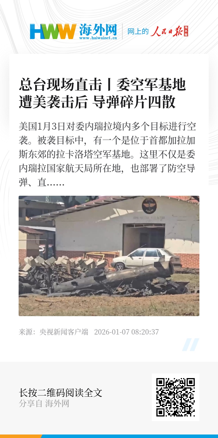 总台记者 雷湘平:我现在正在加拉加斯市东郊的拉卡洛塔空军基地,这个基地在1月3日凌晨的空袭中成为空袭目标。我身后这块被震碎的玻璃,就是当时空袭所留下来的痕迹。距离不远处,有一个防空导弹基地。在美军的袭击中,基地一套“山毛榉”防空导弹被击毁,当时造成1人受伤。
