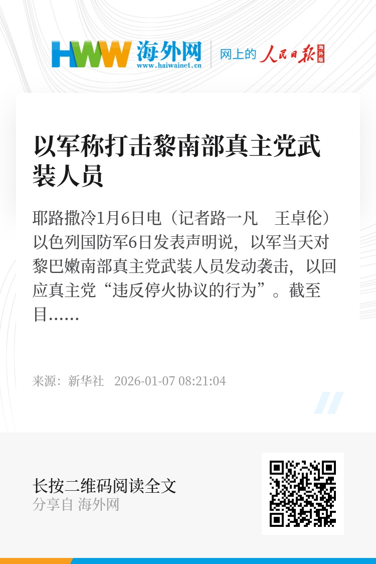 新华社耶路撒冷1月6日电(记者路一凡 王卓伦)以色列国防军6日发表声明说,以军当天对黎巴嫩南部真主党武装人员发动袭击,以回应真主党“违反停火协议的行为”。