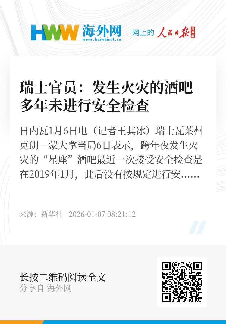 新华社日内瓦1月6日电(记者王其冰)瑞士瓦莱州克朗-蒙大拿当局6日表示,跨年夜发生火灾的“星座”酒吧最近一次接受安全检查是在2019年1月,此后没有按规定进行安全检查。